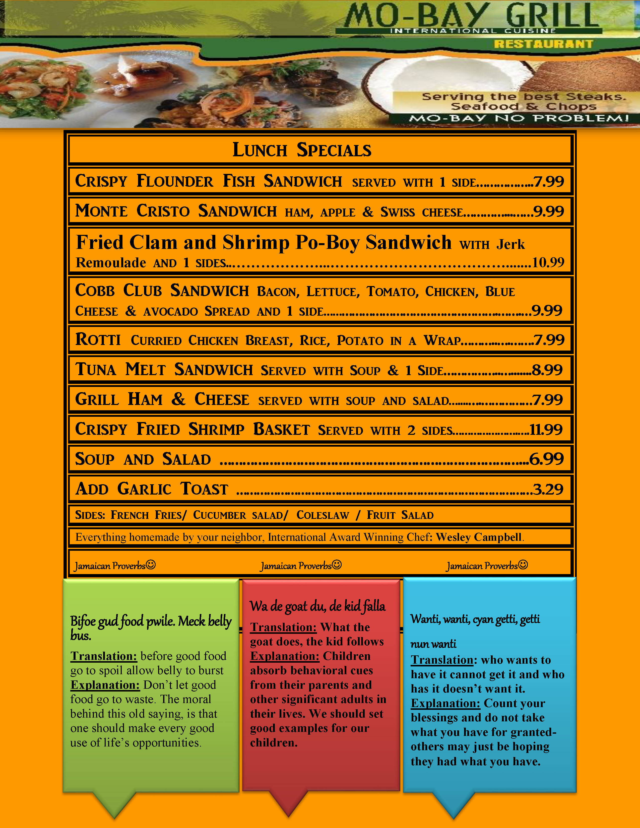 International Grocery. International Food Club menu. British Greek Indian Lebanese etc.